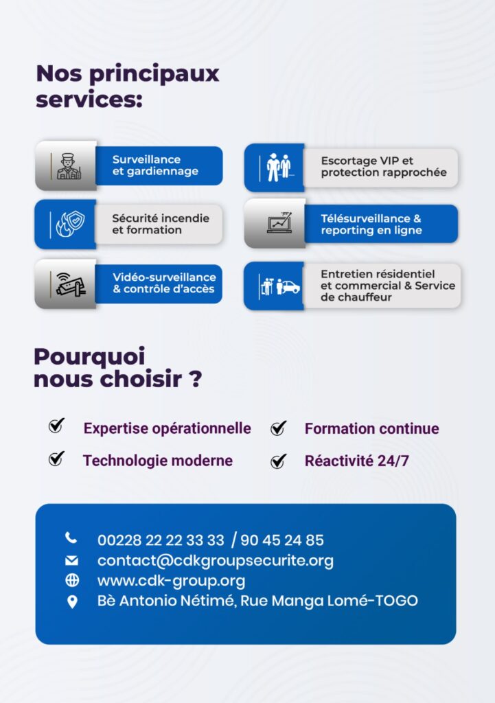 CDK Group Sécurité lance une vaste campagne de recrutement d’agents de sécurité afin de consolider sa présence sur l’ensemble du territoire national. L’entreprise, spécialisée dans les prestations de sécurité professionnelle, met un accent particulier sur certaines zones stratégiques du Grand Lomé et de ses environs. Dans une dynamique d’inclusion, la société encourage fortement les candidatures féminines, affirmant ainsi sa volonté de promouvoir le genre dans un secteur longtemps dominé par les hommes.